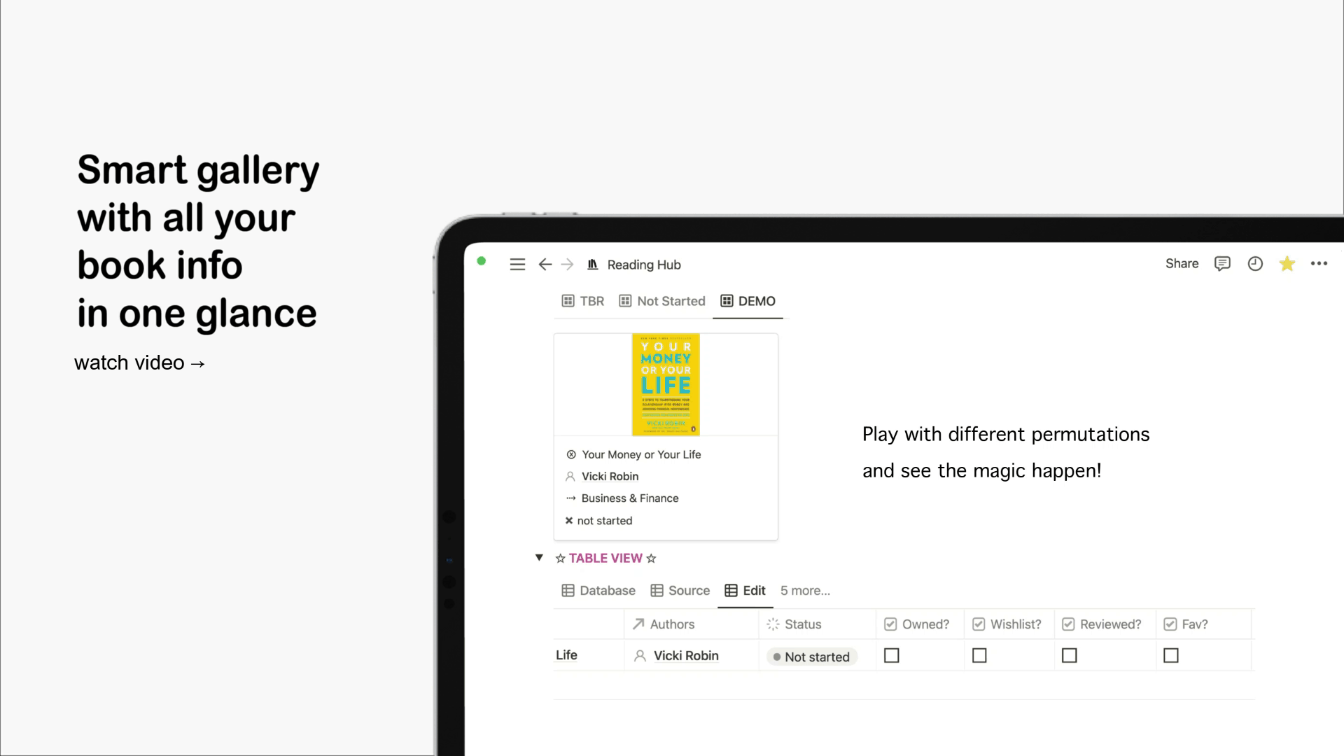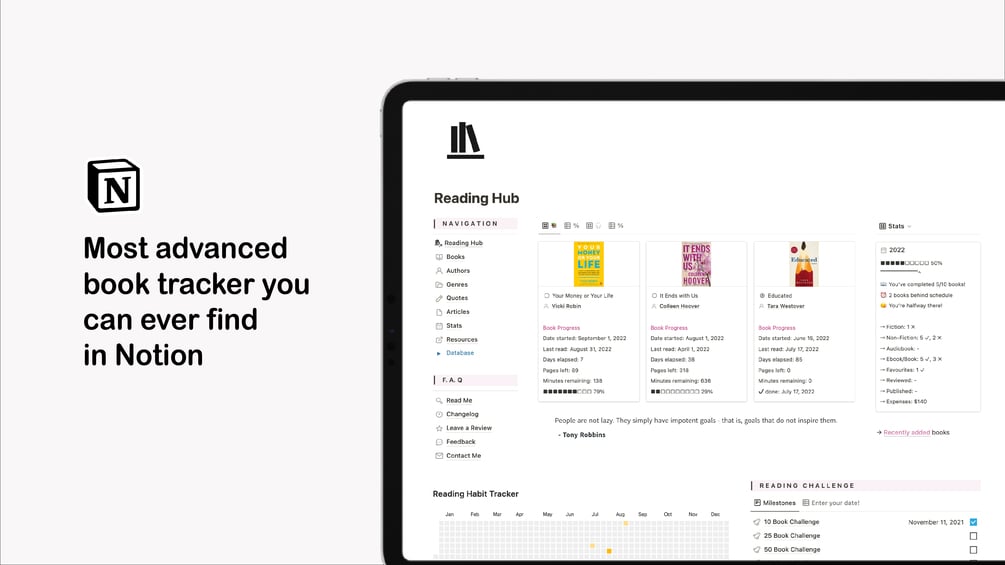 This Reading Hub is designed to work like a dedicated space to track your book reads, collate your thoughts, and turn it into actionable insights. Comes with full on-boarding instructions and videos to guide your along.