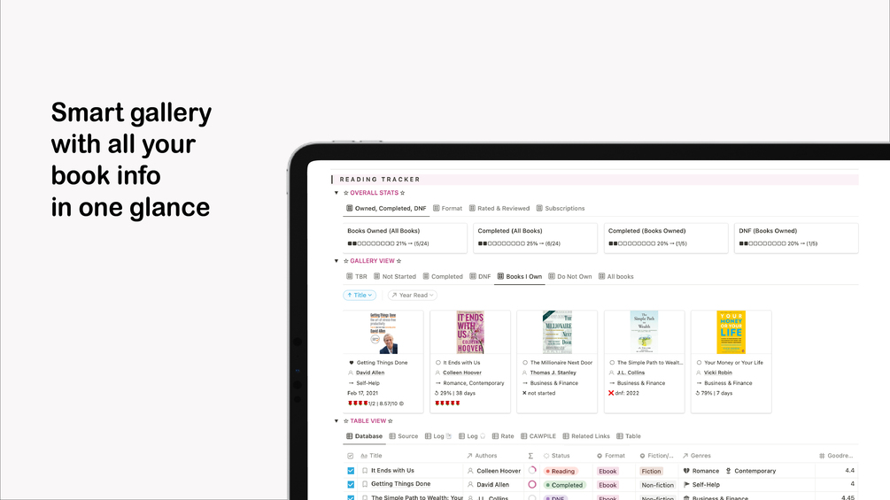 - Multiple gallery views included: TBR, Not started, Completed, DNF, Books Own, Favourites, Ratings, Year Read etc